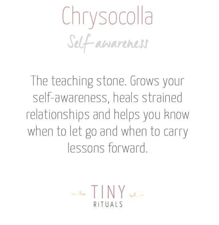 Chrysocolla itself is all about sharpening the tools of self-awareness. As a blue-green stone, it connects to the throat chakra – the seat of our truth and communication. Chrysocolla helps to clear the throat of any blockages, ensuring that your voice, your wisdom, and your heart-self can flow from your centre and out into the world. Woven with strands and shades of green, Chrysocolla also calls to the heart. When our hearts are flushed and pure and open, we can hold ourselves strong even at our most vulnerable, paving the way for love, passion, and power to shine.