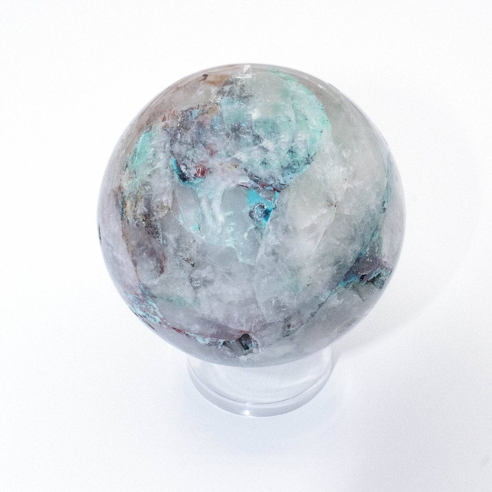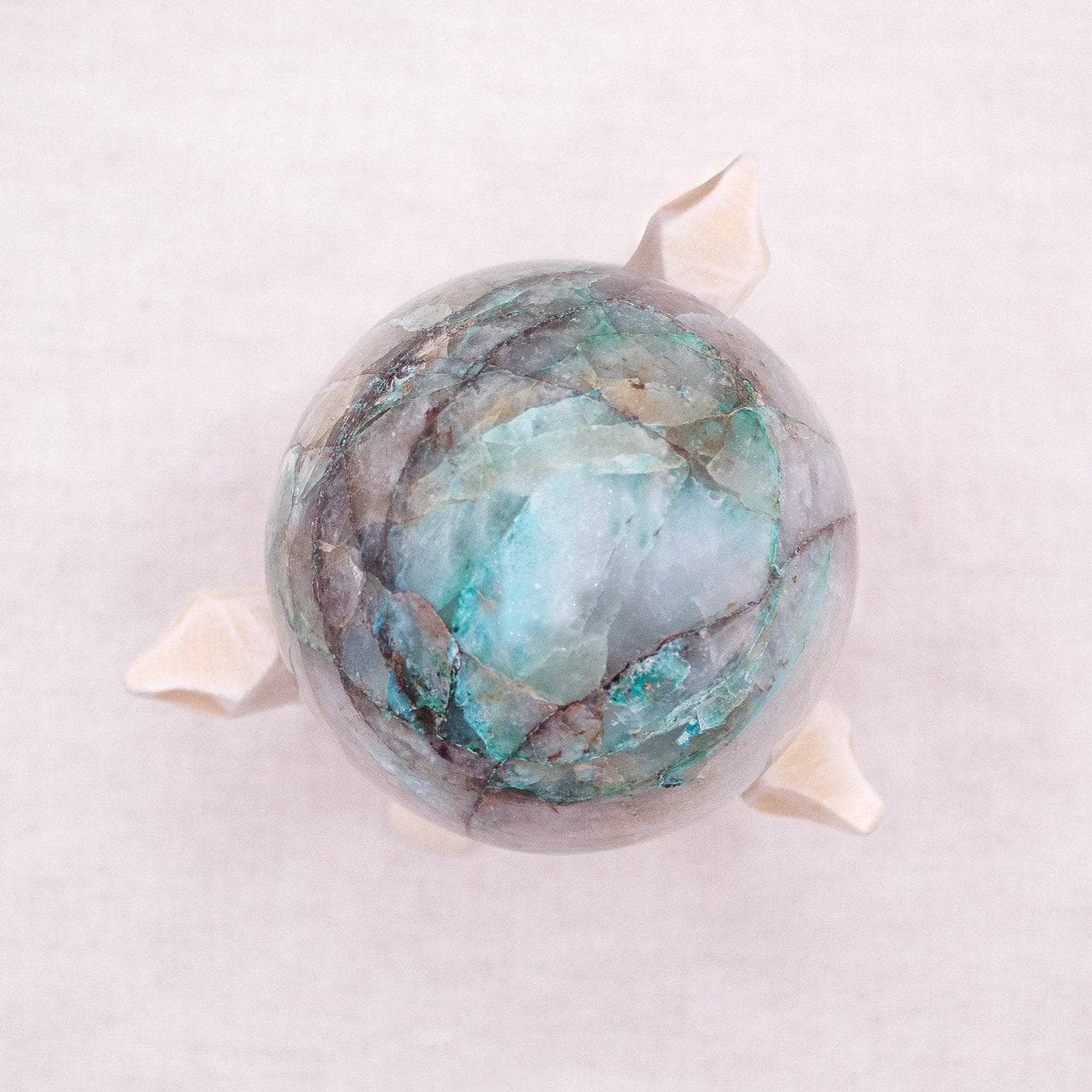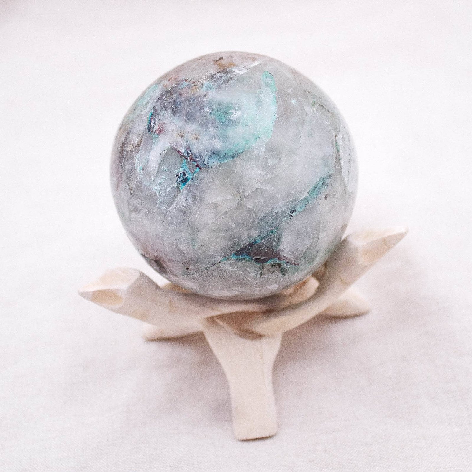 Formed from the rare fusion of Chrysocolla, Shattuckite, Dioptase, Malachite, and Smoky Quartz, Quantum Quattro is revered as a master healer. Polished into radiant spheres, each piece is truly one-of-a-kind, channeling harmony, transformation, and balanced energy in every direction.